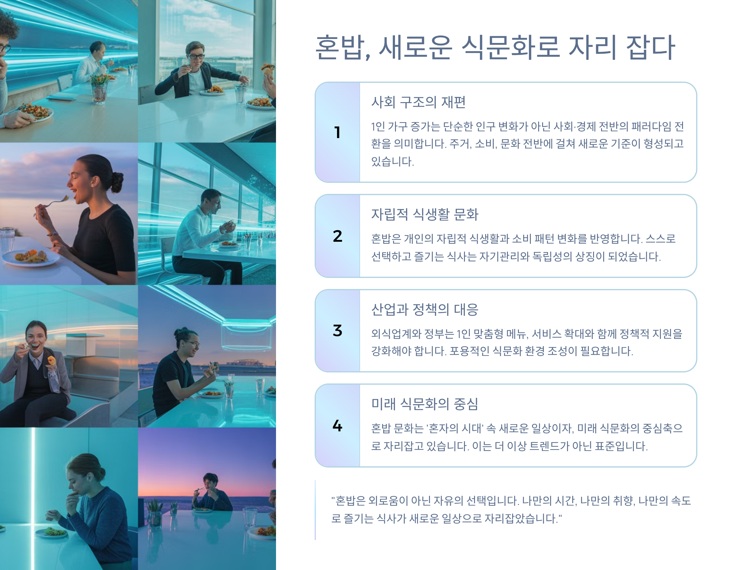 혼밥은 고립이 아닌 자립입니다. 1인 가구 시대에 나만의 식사를 정성스럽게 준비하고, 자신만의 방식으로 삶을 꾸려가는 혼밥족은 앞으로 더 주목받는 트렌드가 될 것입니다.