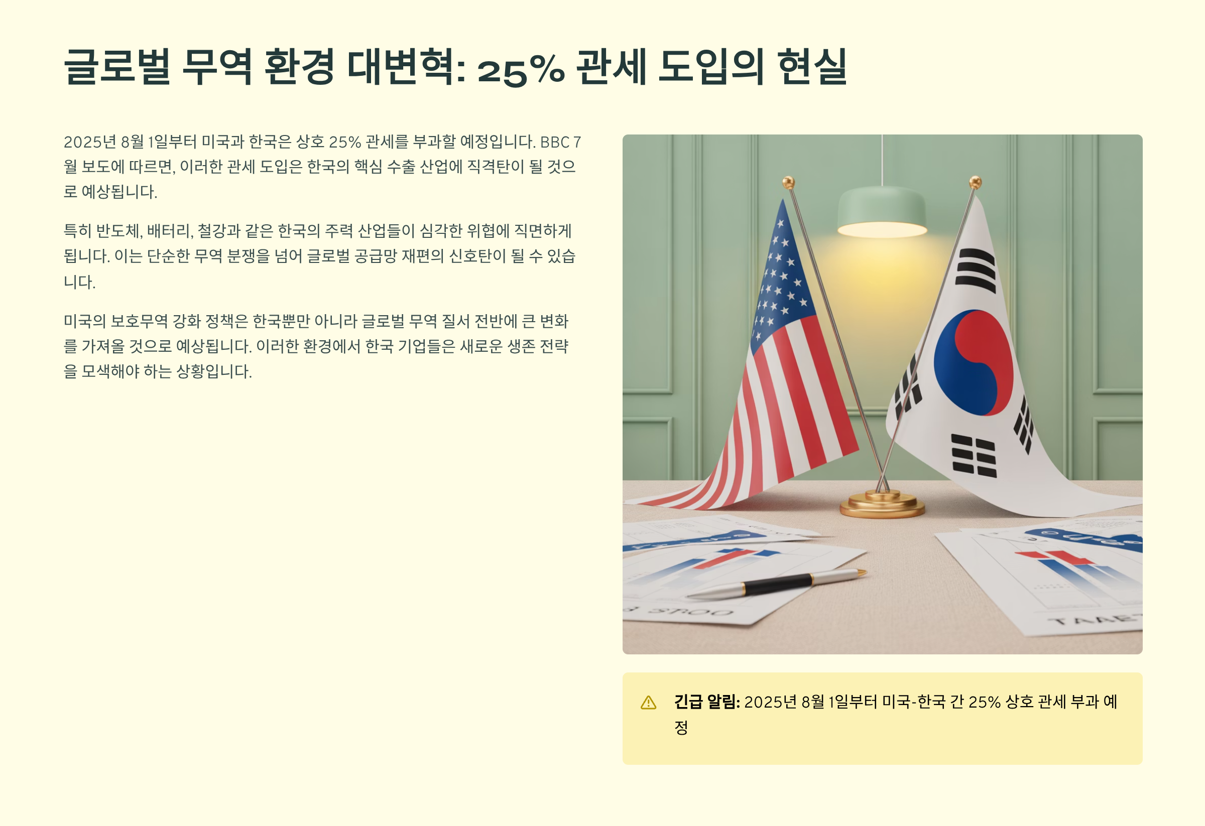 2025년 글로벌 보호무역주의가 재점화되며, 미국과 유럽 일부 국가가 특정 국가 제품에 25%의 고율 관세를 적용하는 시나리오가 현실화될 가능성이 커지고 있습니다. 특히 반도체, 배터리, 철강 등 한국의 주력 수출 품목이 주요 타깃이 되고 있어 파급력이 클 것으로 분석됩니다.