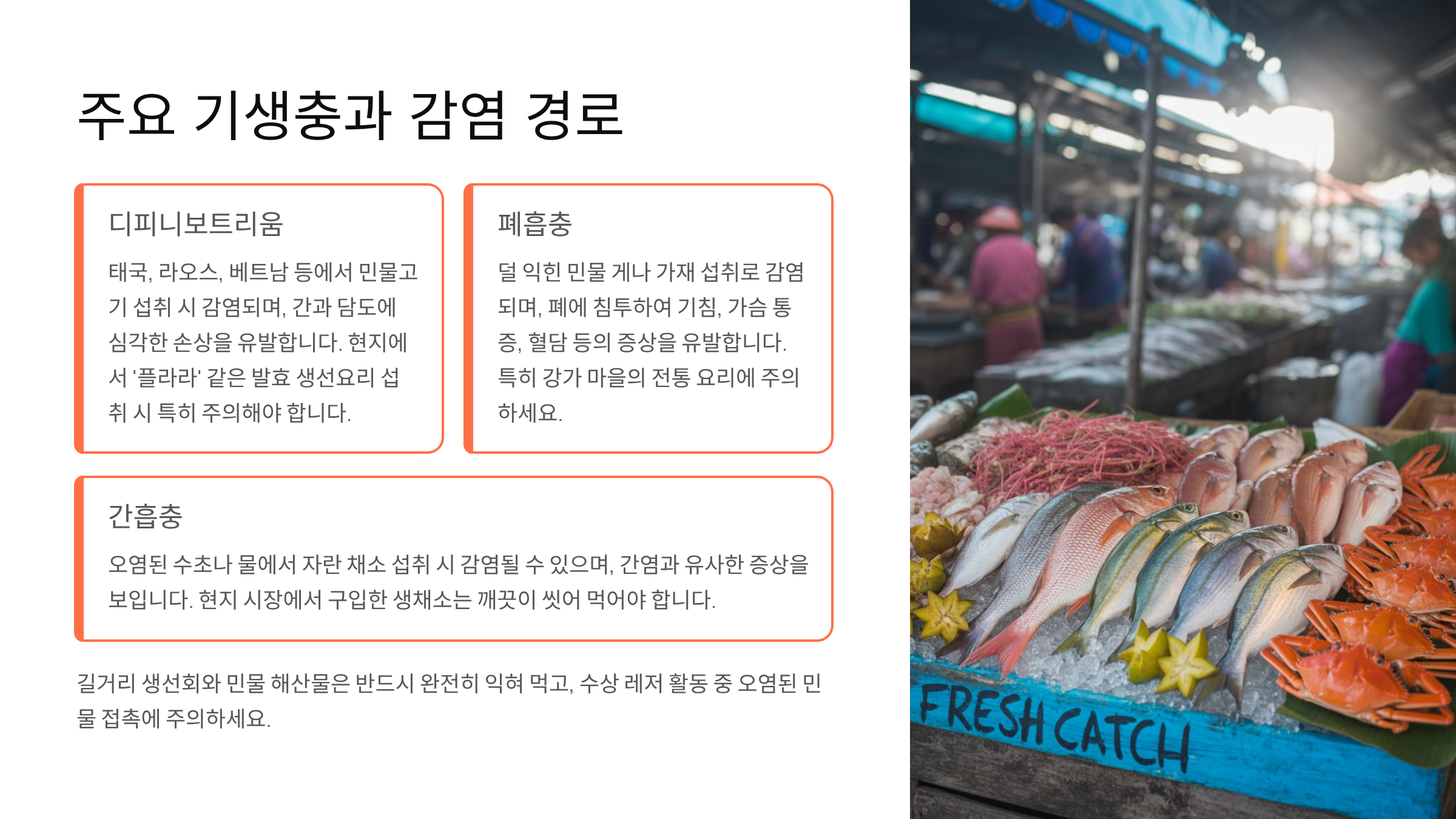2025년 기준 동남아시아 지역은 여전히 기생충 감염 위험지역입니다. 특히 현지에서 즐기는 길거리 음식이나 수상 레저 활동을 통해 디피니보트리움(Diphyllobothrium)과 같은 기생충에 쉽게 감염될 수 있어 주의가 필요합니다.