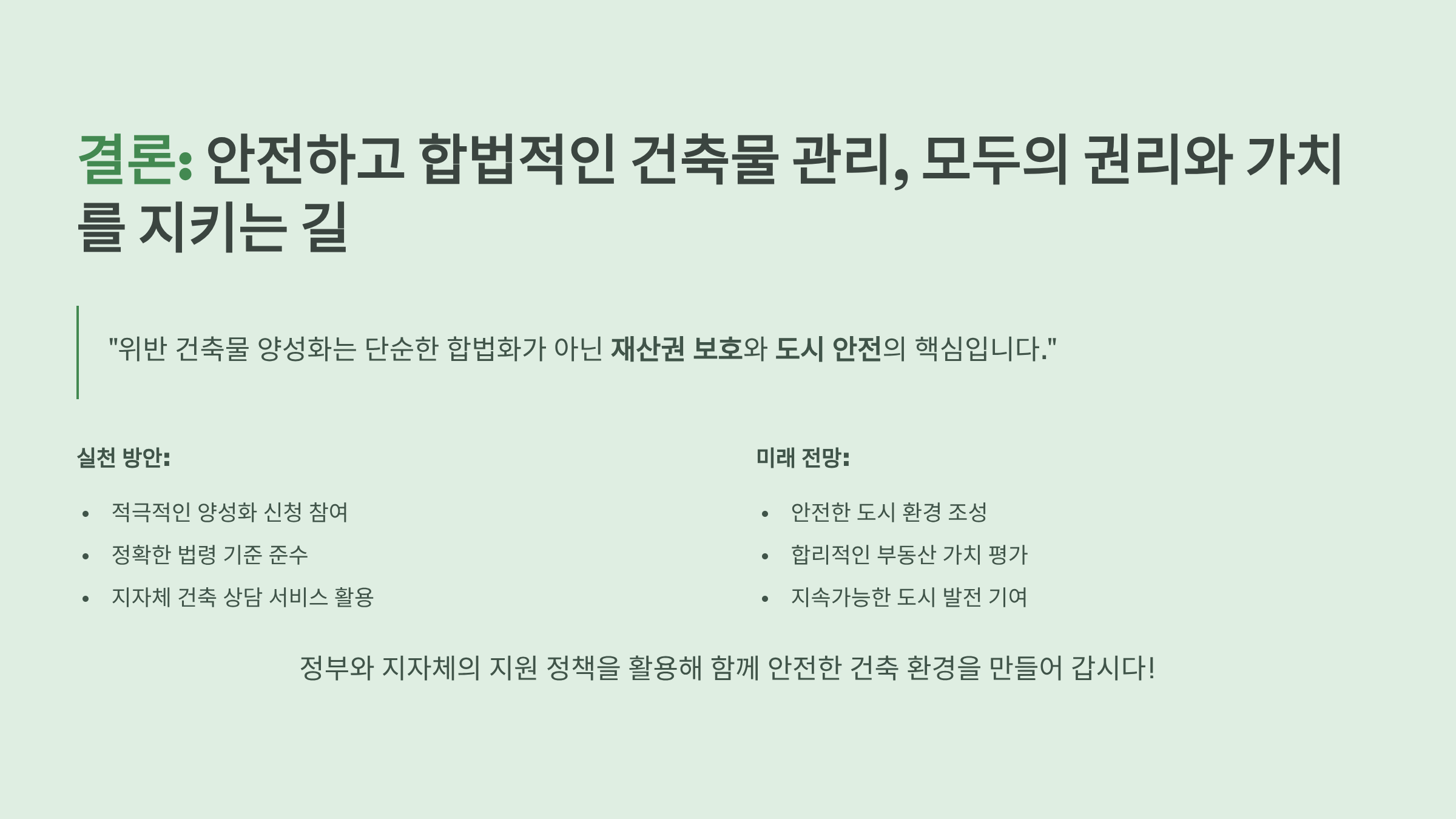 불법건축물 양성화는 재산권 보장, 세금 불이익 해소, 안전성 확보라는 세 가지 효과를 동시에 얻을 수 있는 제도입니다. 특히 2025년 정부는 도시계획 안정화를 위해 양성화 추진을 더욱 강화하고 있습니다.