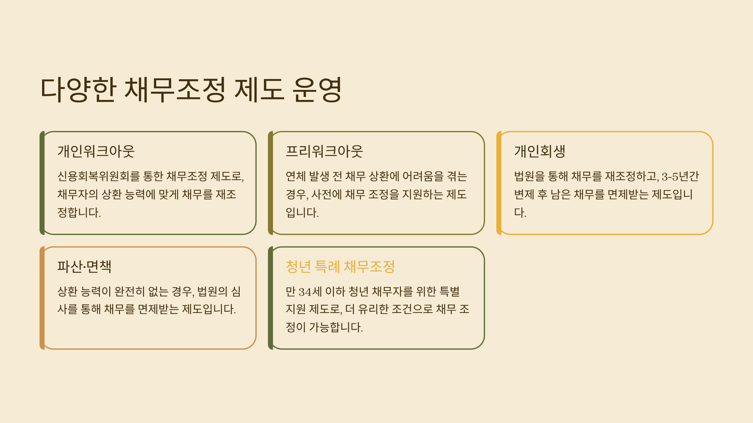 - 특례 채무조정: 청년·저소득층을 대상으로 한 한시적 원금 감면 및 장기 상환유예