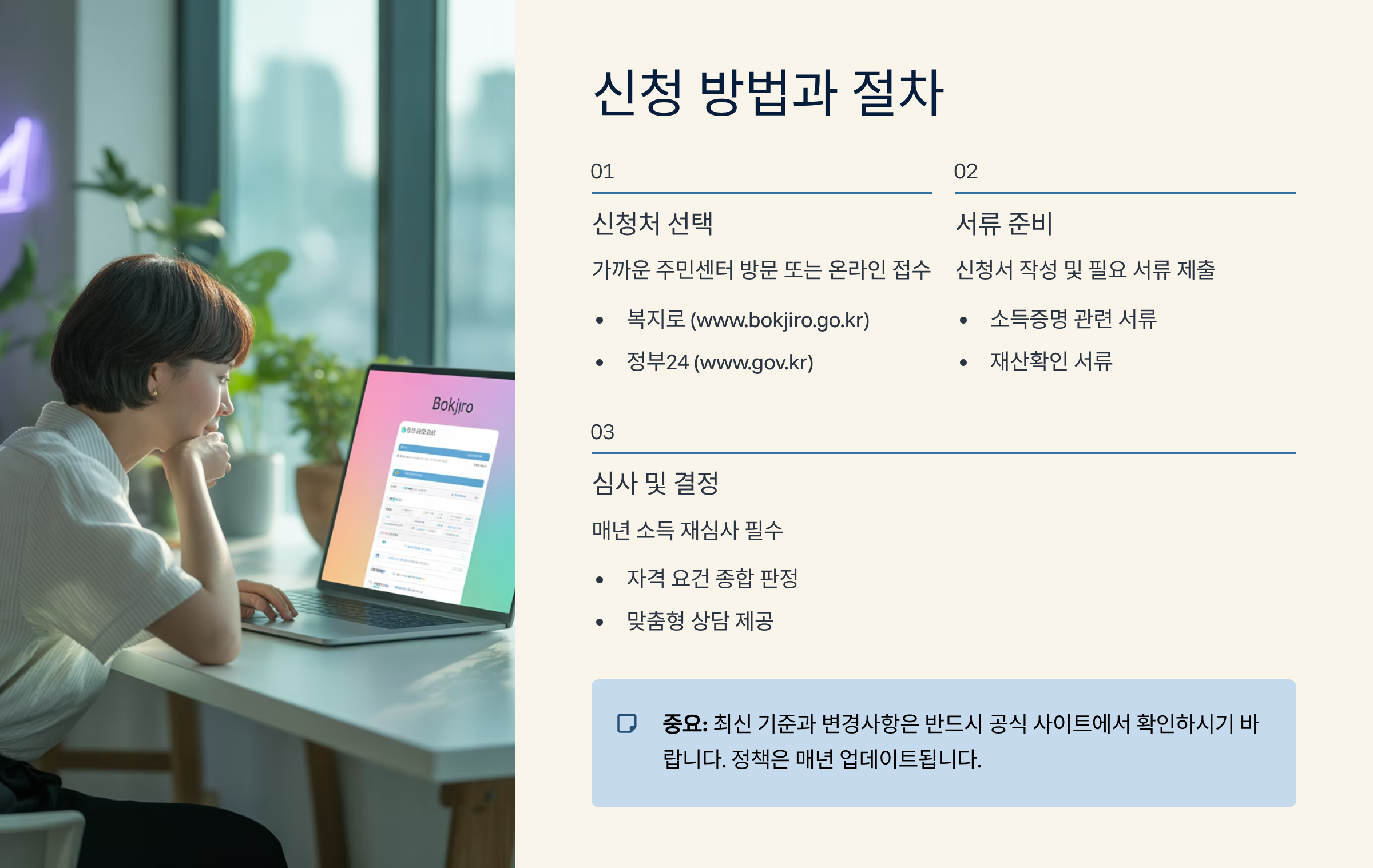 - 자격 유지 확인: 매년 소득 및 재산 변동에 따라 자격이 달라질 수 있습니다.